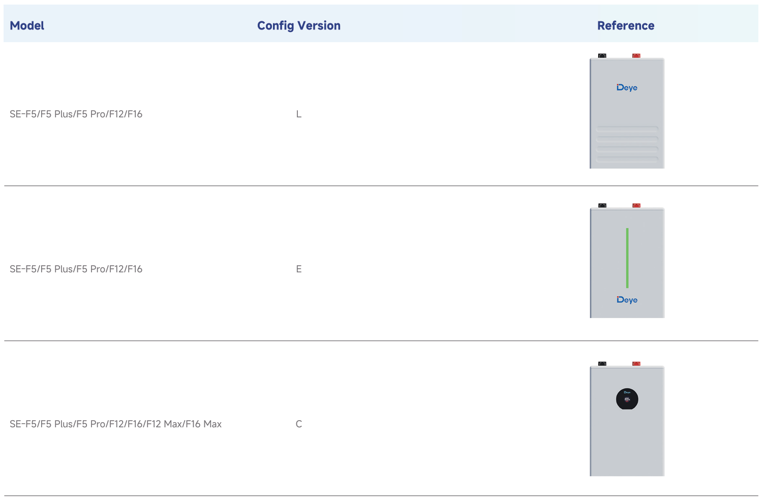 Deye uvádí tři verze konfigurace, které primárně mění vzhled předního panelu a indikaci uživatele: